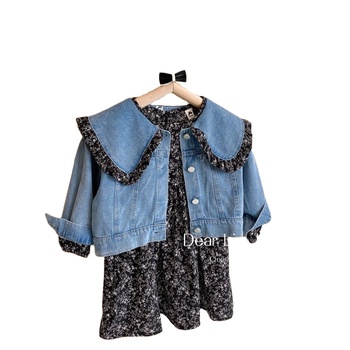 مجموعات ملابس الأطفال للربيع والخريف من قطعتين ، جاكيت الدنيم للفتيات والأطفال ، وأزهار من عمر 2-8 سنوات